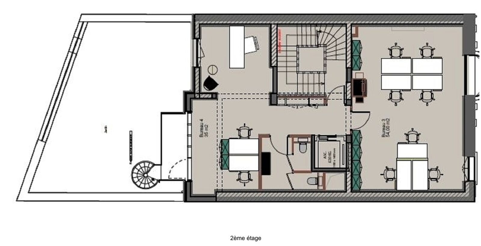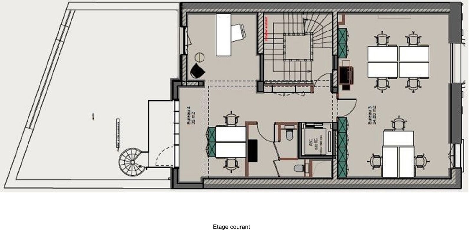 | 2ème étage | Bureaux | 104 m² | Immédiate | 3-6-9 ans ou Dérogatoire | 740 € HT/HC/m²/an | N.C. |