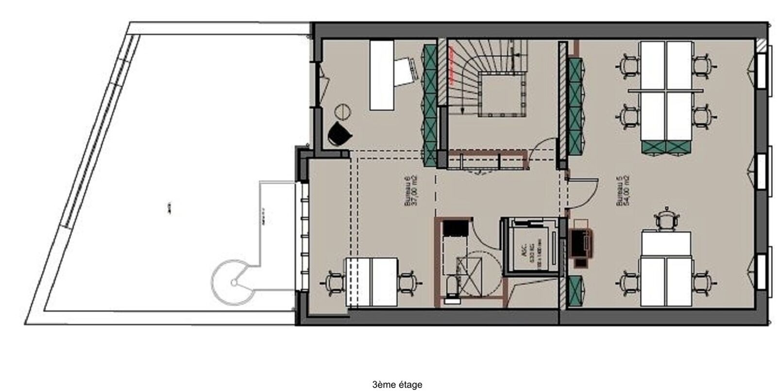 | 3ème étage | Bureaux | 110 m² | Immédiate | 3-6-9 ans ou Dérogatoire | 740 € HT/HC/m²/an | N.C. |